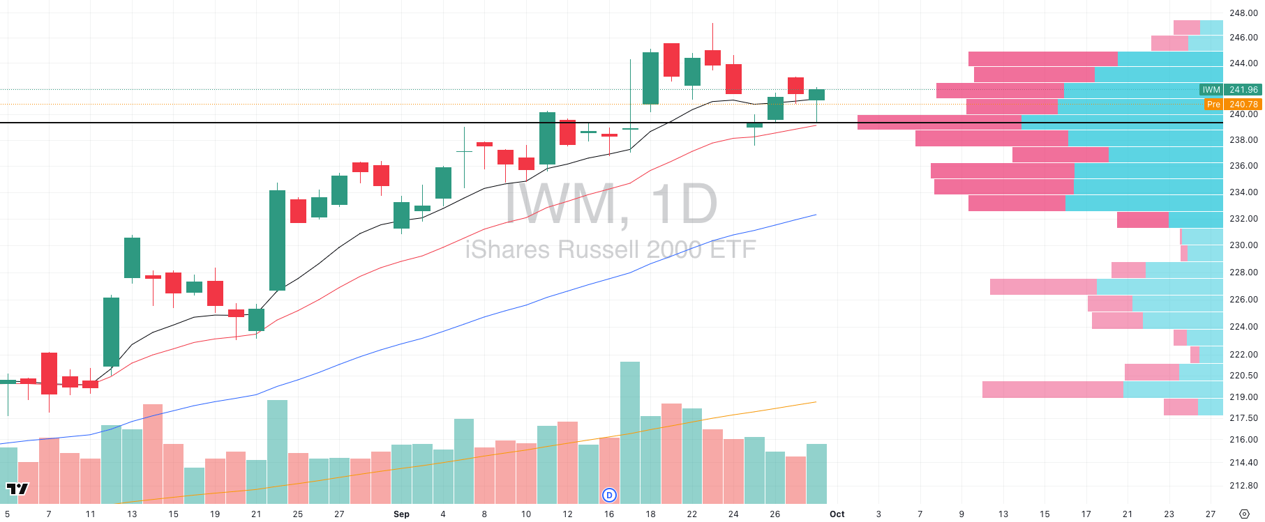 Small caps staged a constructive bounce yesterday off the rising 20-day EMA, which also aligns with the point of control (POC) around $239. That defense came on 92% relative volume, enough to suggest buyers were active at the shelf but nothing special.