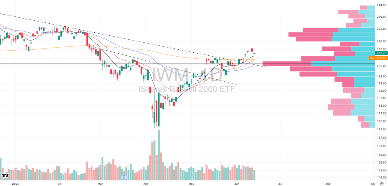 Growth-focused indices like QQQ and IWM are testing key short-term support levels like the 10-EMA and Point of Control. Midcaps are holding up better, but upside is capped for now. This is healthy, even if uncomfortable.