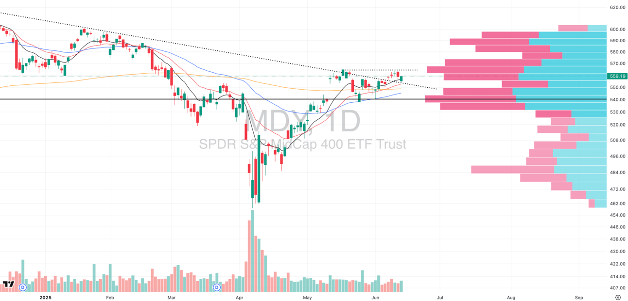 Midcaps (MDY) showed a solid response yesterday — bouncing cleanly off the rising 10-day EMA and reclaiming short-term momentum. Despite broader market volatility tied to geopolitical concerns, the MDY reaction has been impressively muted, signaling underlying strength.