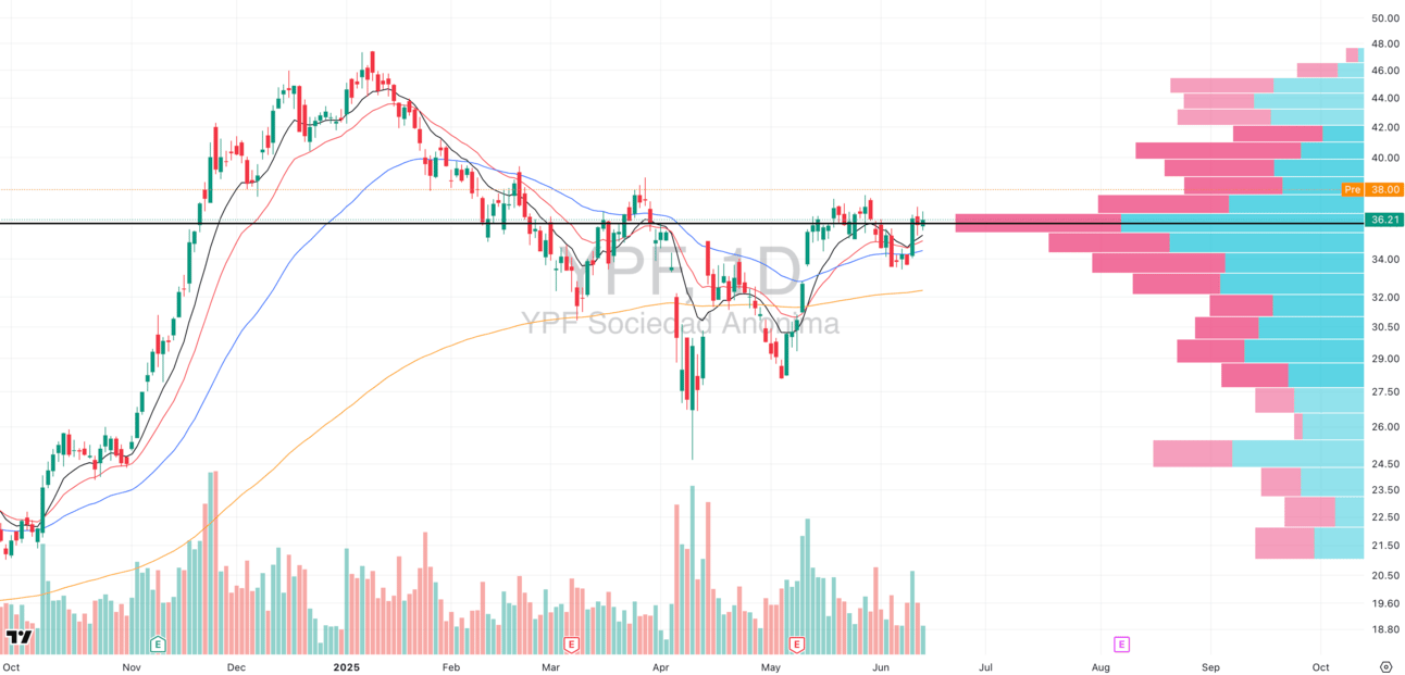 One standout is YPF, which has just launched out of a clean reversal pattern and is now tightening right on its Point of Control (POC). This morning, YPF gapped up sharply and is attempting to push through a dense overhead supply zone around $38 — a level that’s capped price for months.