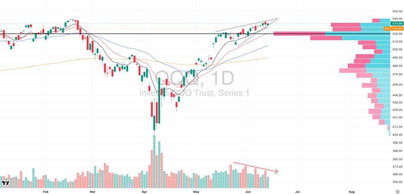 The tech-heavy QQQ is starting to show signs of short-term exhaustion. While price has steadily pushed higher, we’ve seen a clear and persistent decline in relative volume over the past two weeks — a textbook red flag in momentum markets. This divergence signals fading participation and often precedes a trend change.