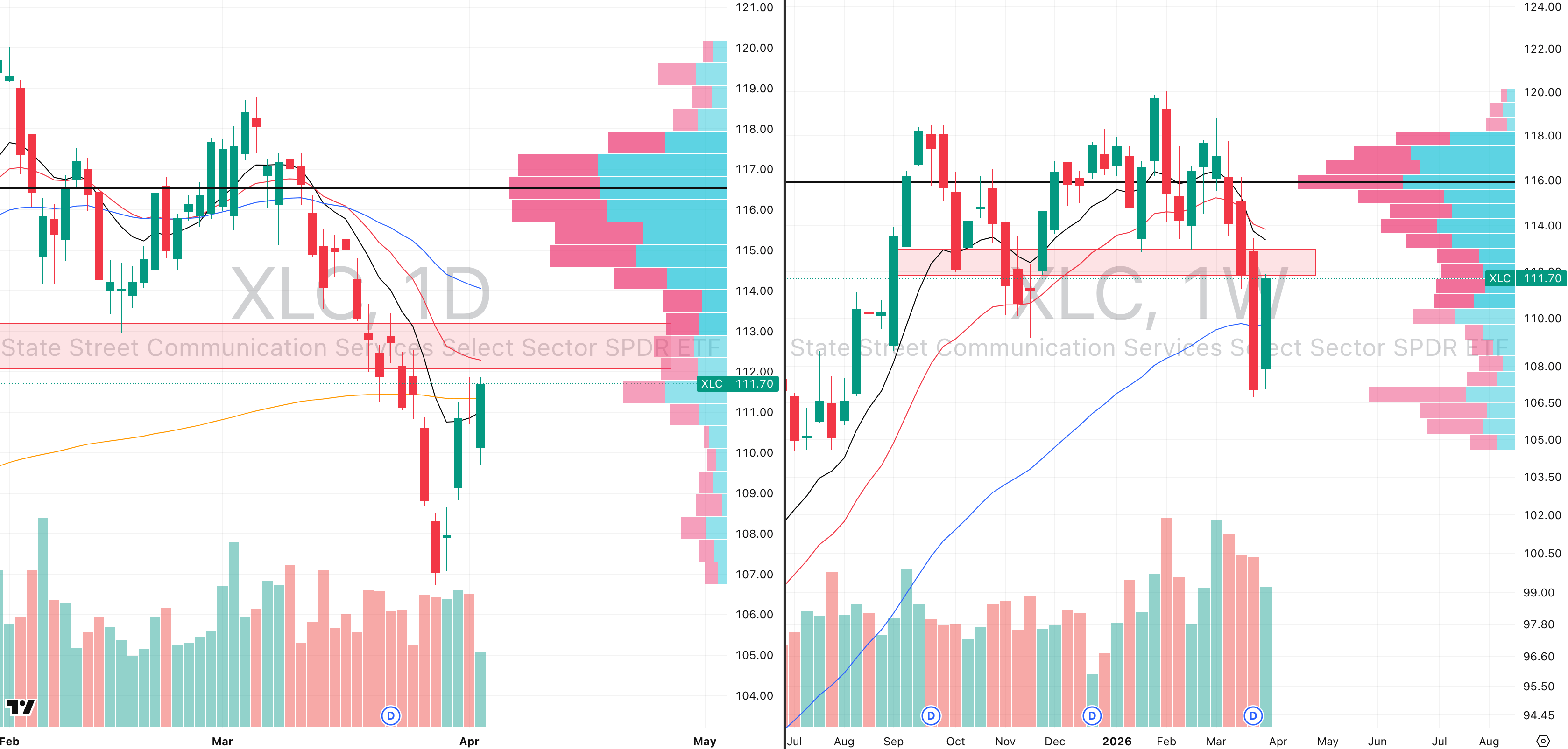 The supply zone up to approximately $113.15 contains significant trapped selling pressure, and consolidation below that level is the base case for the coming week rather than any sustained recovery. The correct framework for trading XLC right now is not to watch the ETF itself, it is to watch Google and Meta directly, as the two highest cap-weighted names will determine where XLC goes regardless of what the remaining constituents do.