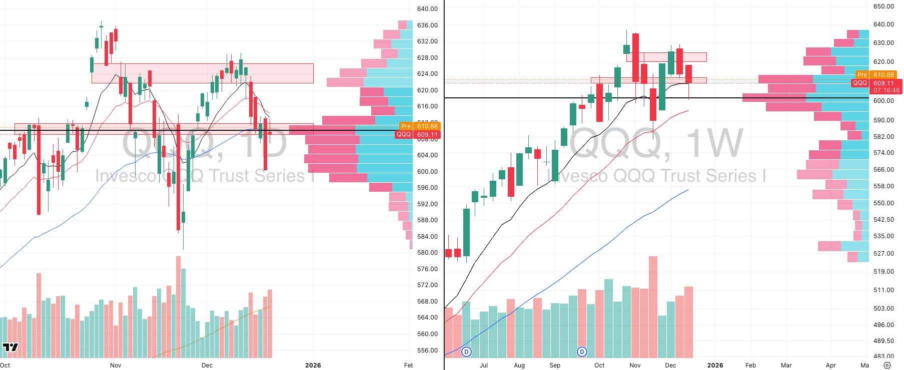 From a structural standpoint, price is still materially higher than Wednesday’s close, and on the weekly chart the bounce off the point of control near 601 was technically impressive and not something to dismiss lightly.