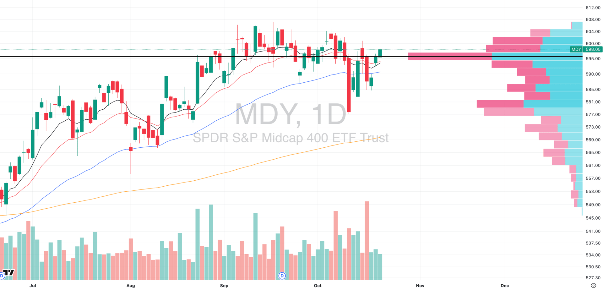 MDY continues to chop sideways inside its range, with no conviction from either side. Yesterday’s session printed just 71% of its 20-day average volume - even lighter than Monday or Tuesday - confirming lack of engagement.