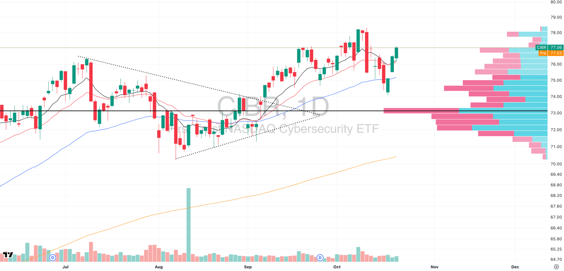 Focused Stock – PLTR: Holding a tight consolidation since August, maintaining strong relative strength within cybersecurity. CIBR’s group rebound reinforces the setup, but we’re waiting for a confirmed breakout with higher volume before re-engaging.