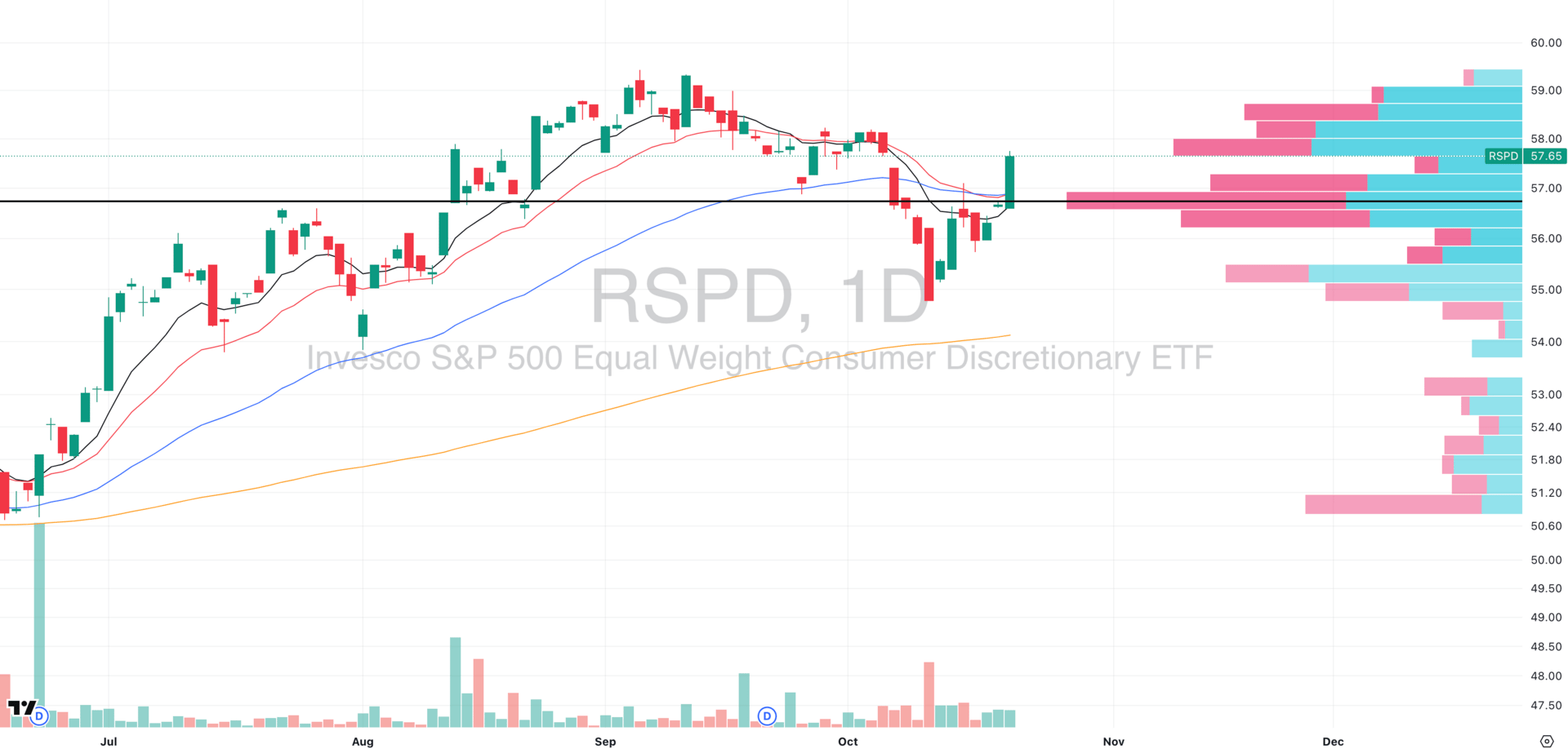 We didn’t expect consumer discretionary to bounce this strongly as both XLY (cap-weighted) and RSPD (equal-weighted) have advanced together, showing broad participation rather than leadership confined to a few mega caps.