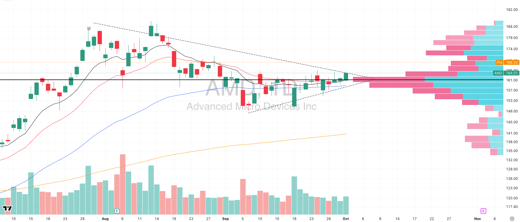 Advanced entry (Sept 18): A pullback long was available around $154, where AMD posted a high-volume reversal. That was the kind of setup only advanced traders catch as you’re buying strength off a volume-backed shakeout and on weakness.