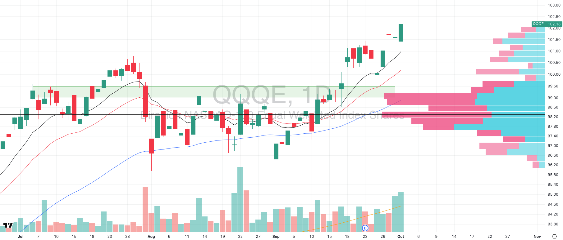 That matters because QQQ can make new highs with just a few mega-cap leaders dragging the index up. QQQE strips that out. When QQQE and QQQ push in tandem, on volume, breadth is confirmed.