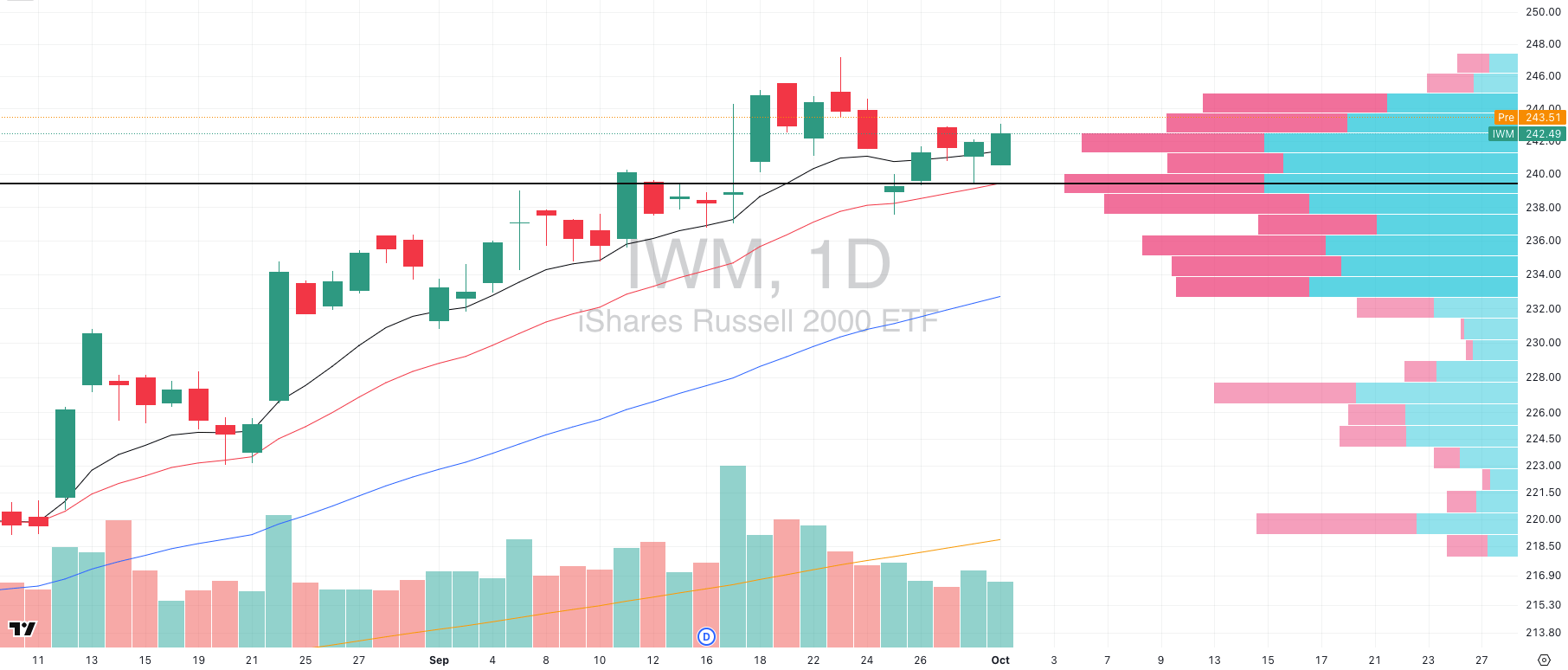 Small Caps (IWM): Clear VCP above $240 POC, likely push toward $245 highs. Stronger than MDY.