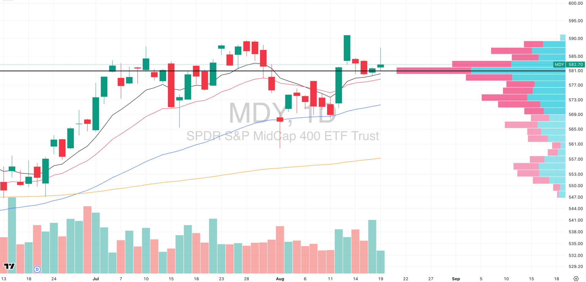 MDY: Repeated distribution → key watch is $580 EMA cluster. Breakdown targets $571.
