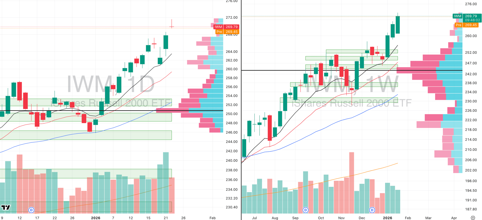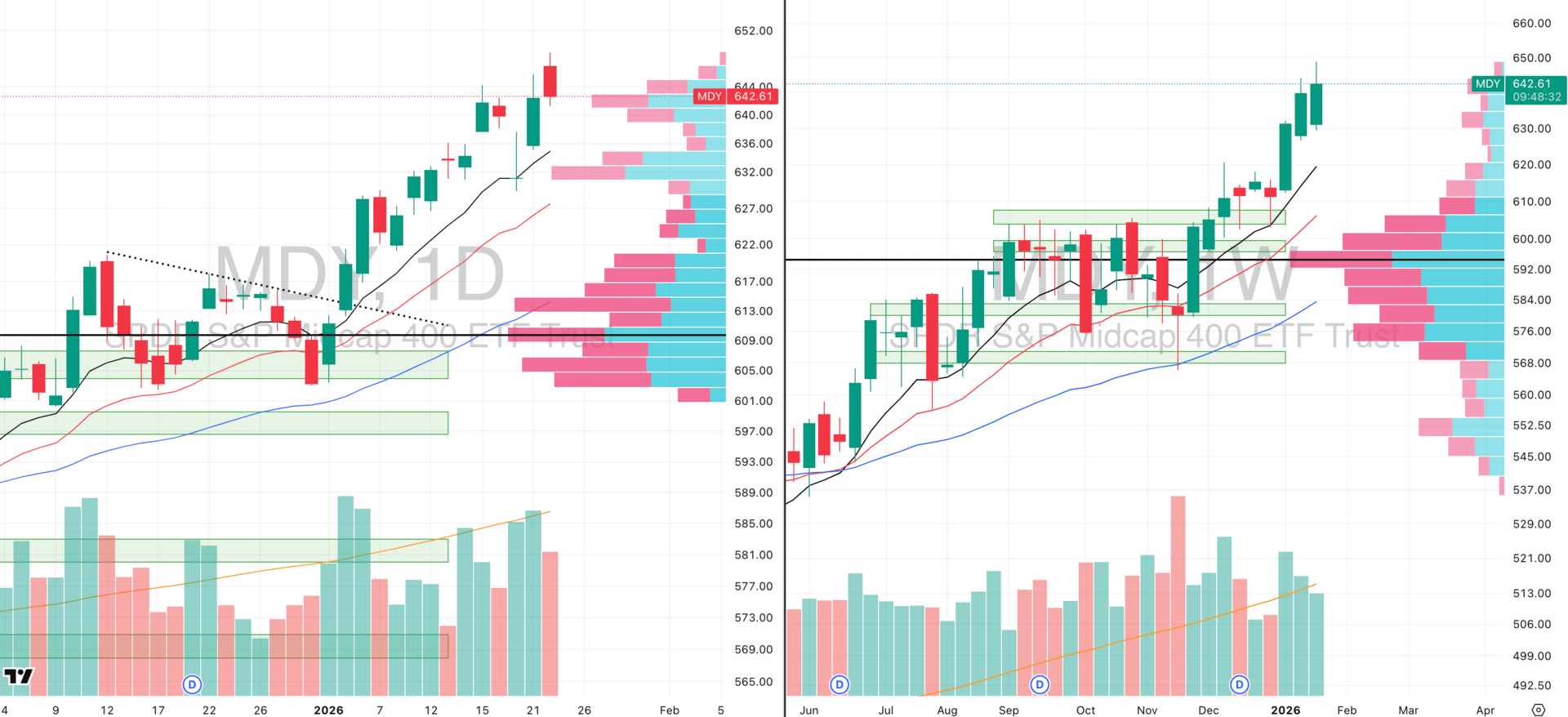 On the weekly chart, the recent sell-off into January 20th–21st found support precisely at the rising 20-week EMA. From an intermediate perspective, the NASDAQ is finding demand where it should.