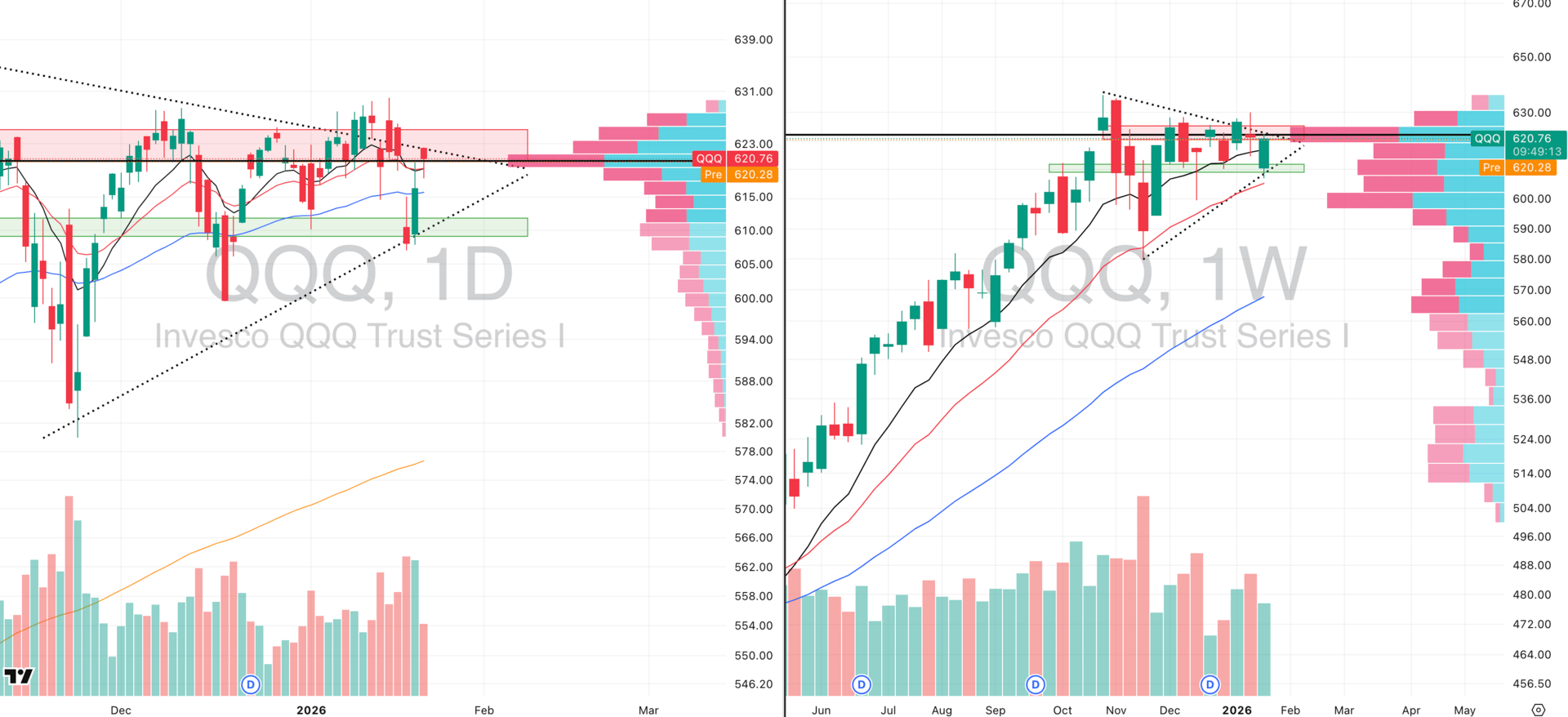 The key structural level is the 50-day EMA at 615.56, which has now been reclaimed. Historically, the NASDAQ tends to chop above the 50-day EMA during uptrends, and this level also aligns with last week’s lows.