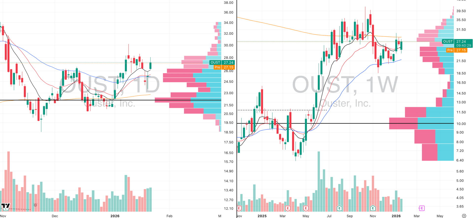 Structurally, this is consistent with continuation behavior. OUST is in a new stage-two advance following a two-year base that extended from February 21st, 2023 to May 27th, 2025, and remains one of the highest-priority names to track for continuation setups.