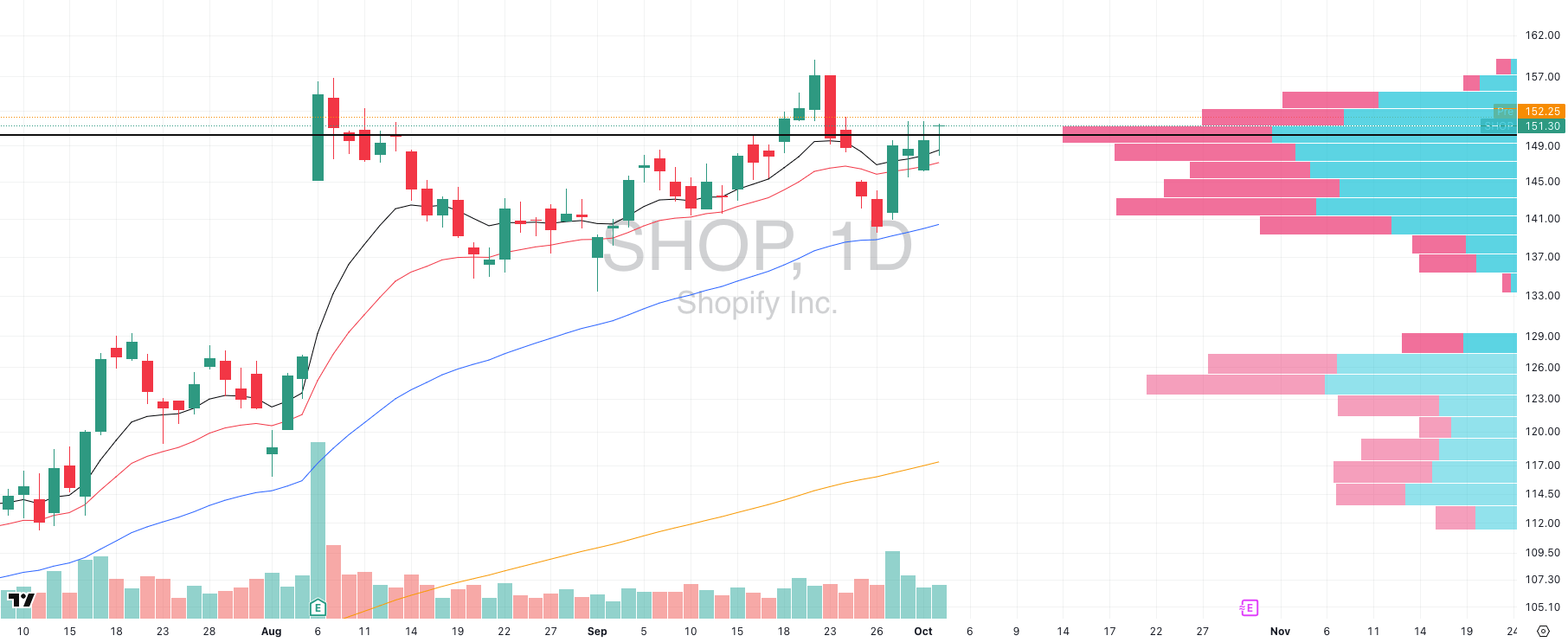 Enter on a subsequent pullback entry if SHOP holds above POC and confirms strength (e.g. gap fill, or on an entry bull flag).