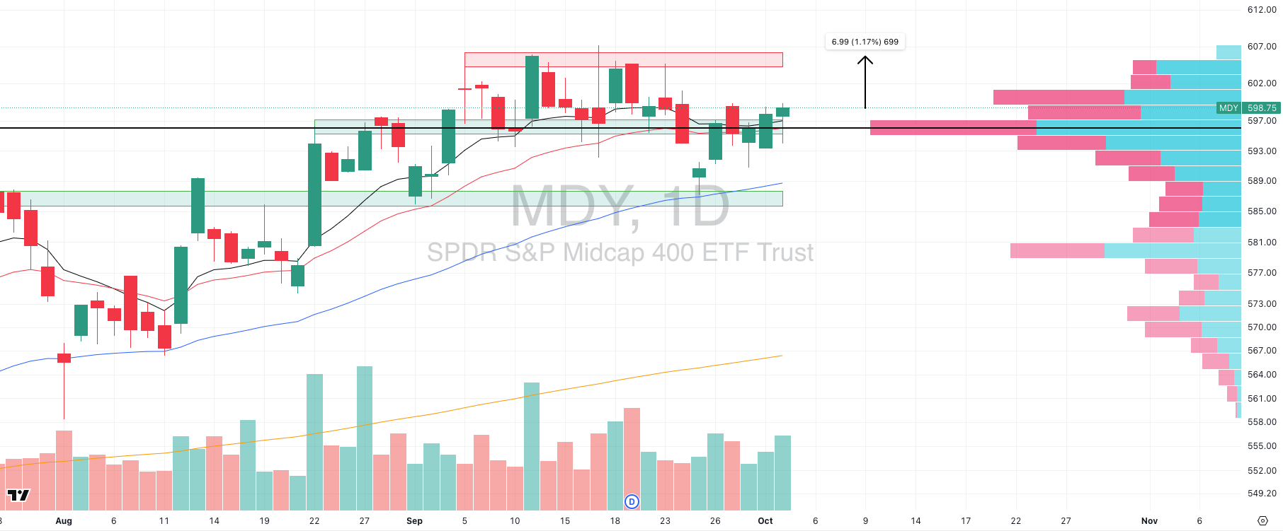 Midcaps (MDY): Buyers defended $595 with a hammer close. Structure points to a +1.2% move into $607 supply zone.