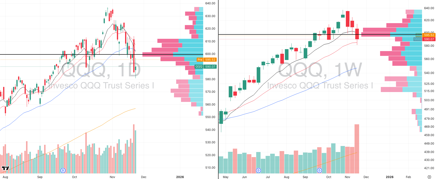 The only structural layer that held was the 20-week EMA at ~$580, which is where buyers finally stepped in. This is the same level of volume that caught QQQ during the April 2025 capitulation, underscoring just how elevated last week’s participation was on the sell side.