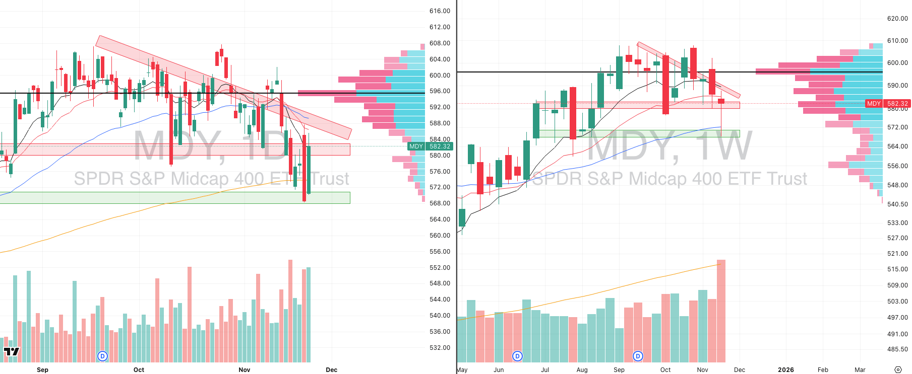 Friday delivered a meaningful high-relative-volume reversal, but this bounce came after a heavy-participation breakdown earlier in the week that drove MDY directly into its $570 demand zone and briefly undercut the 50-week EMA, a level not violated since mid-2024.