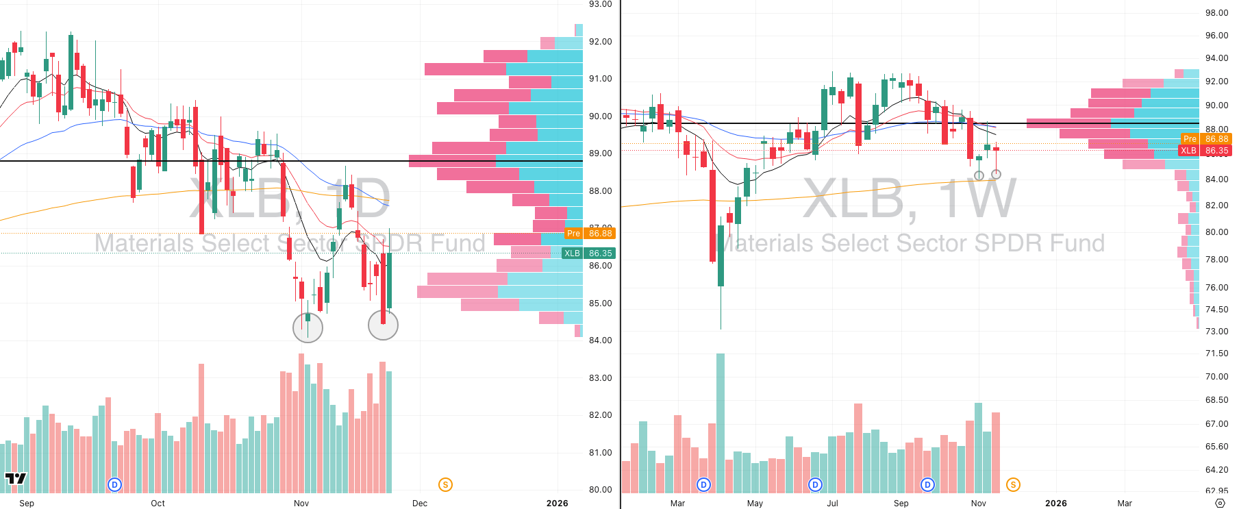 XLB has now printed a clear double-bottom along the rising 200-week EMA, and this is the first time in this corrective period that we’re seeing buyers show up at a meaningful long-term trend level.