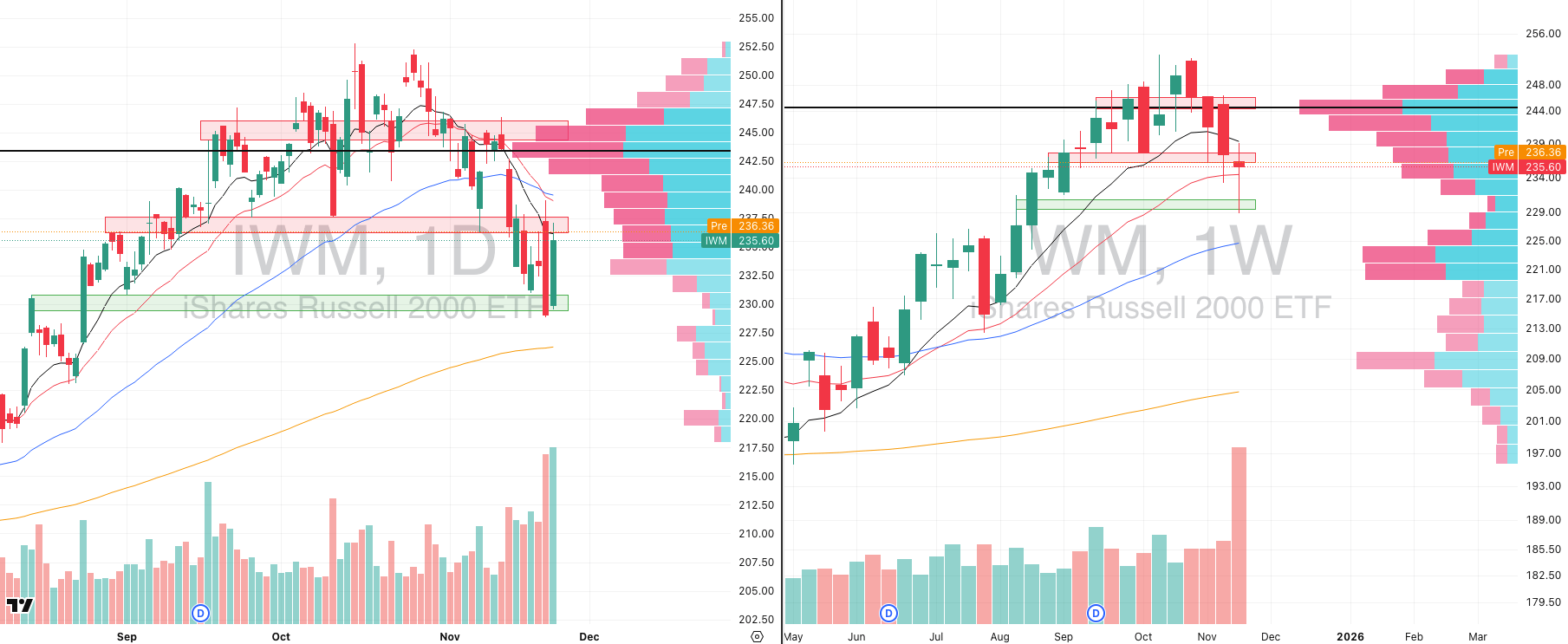 Friday delivered a forceful high-relative-volume reversal and this bounce emerged inside a 275% relative-volume weekly selloff, which drove IWM firmly into the $230 demand zone.