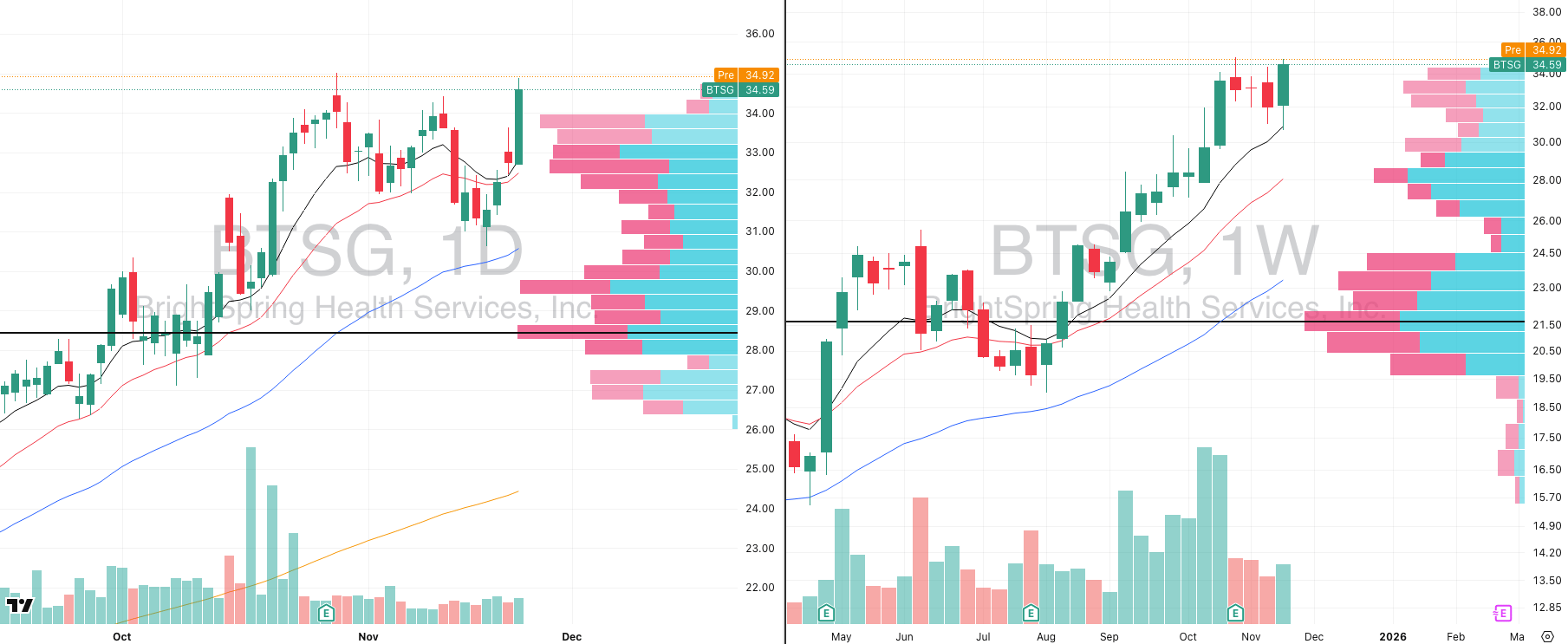 Friday’s breakout came on meaningful participation, confirming that demand is not only intact but accelerating. In a market where the vast majority of charts are fractured, BTSG is demonstrating the opposite with controlled pullbacks, rising support, and decisive expansion when broad conditions allow it.