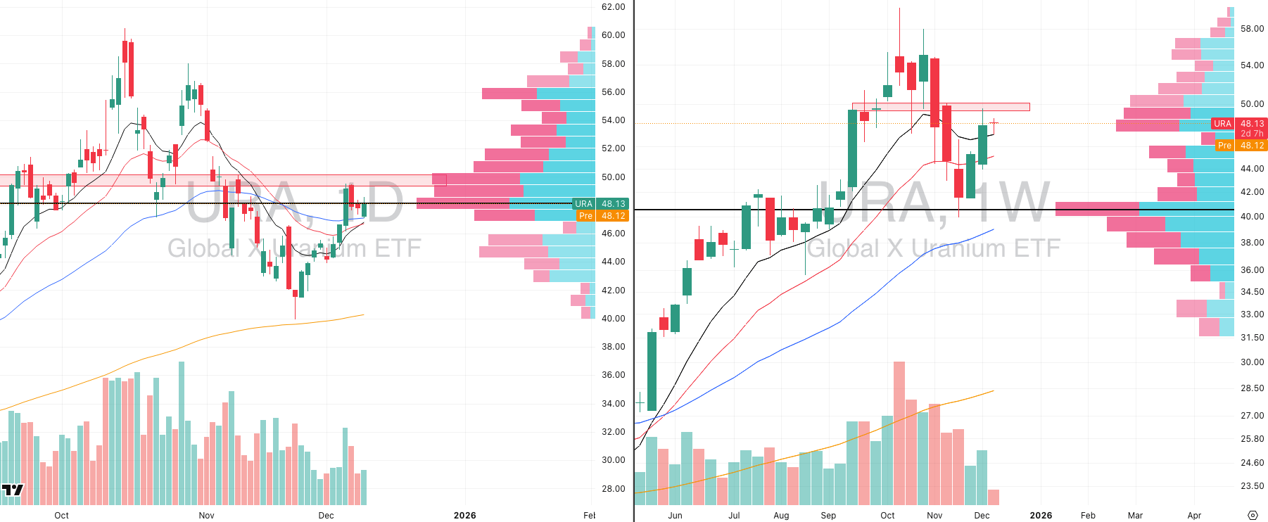 URA has been consolidating just above its point of control around 48, with price holding above key moving averages and refusing to break down despite recent market hesitation.