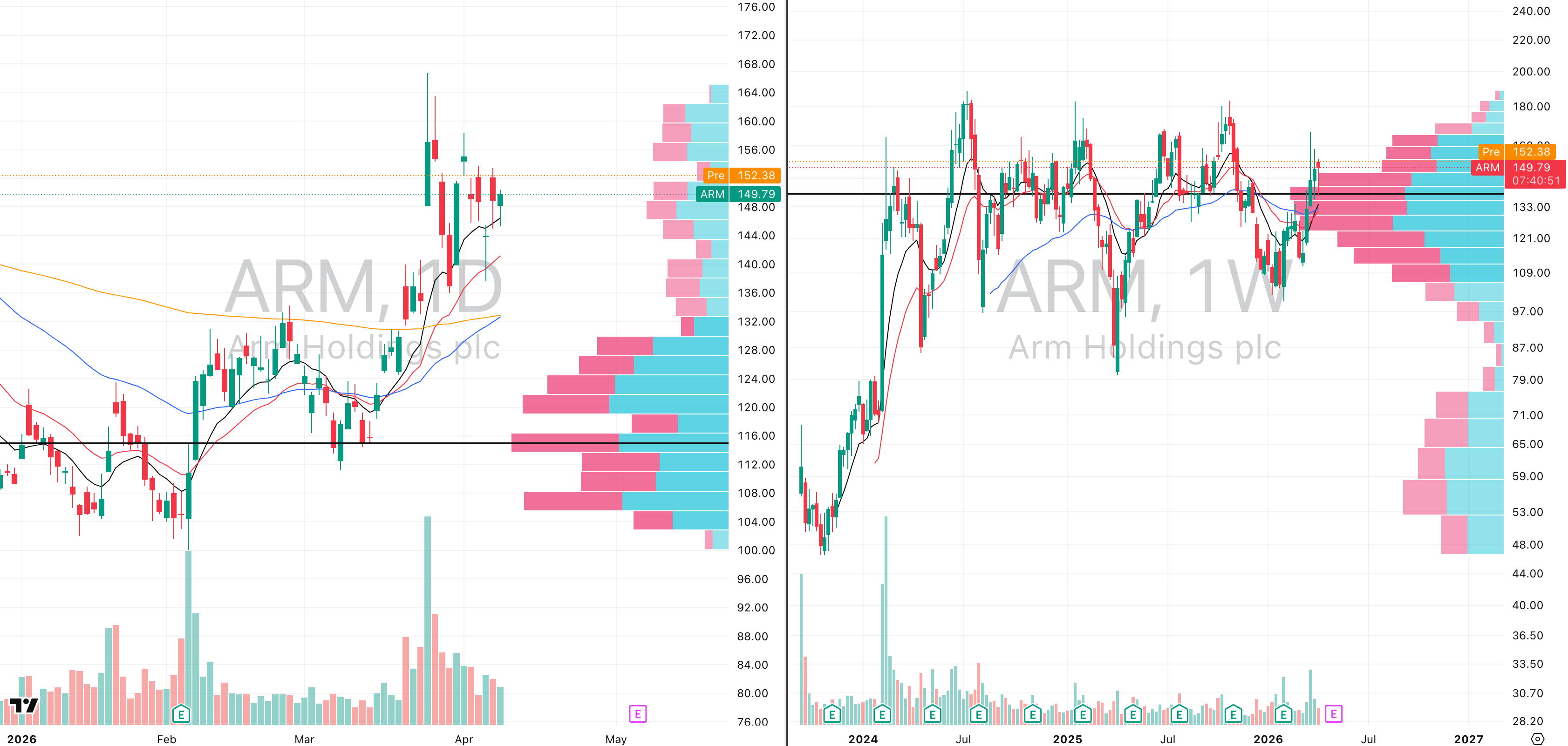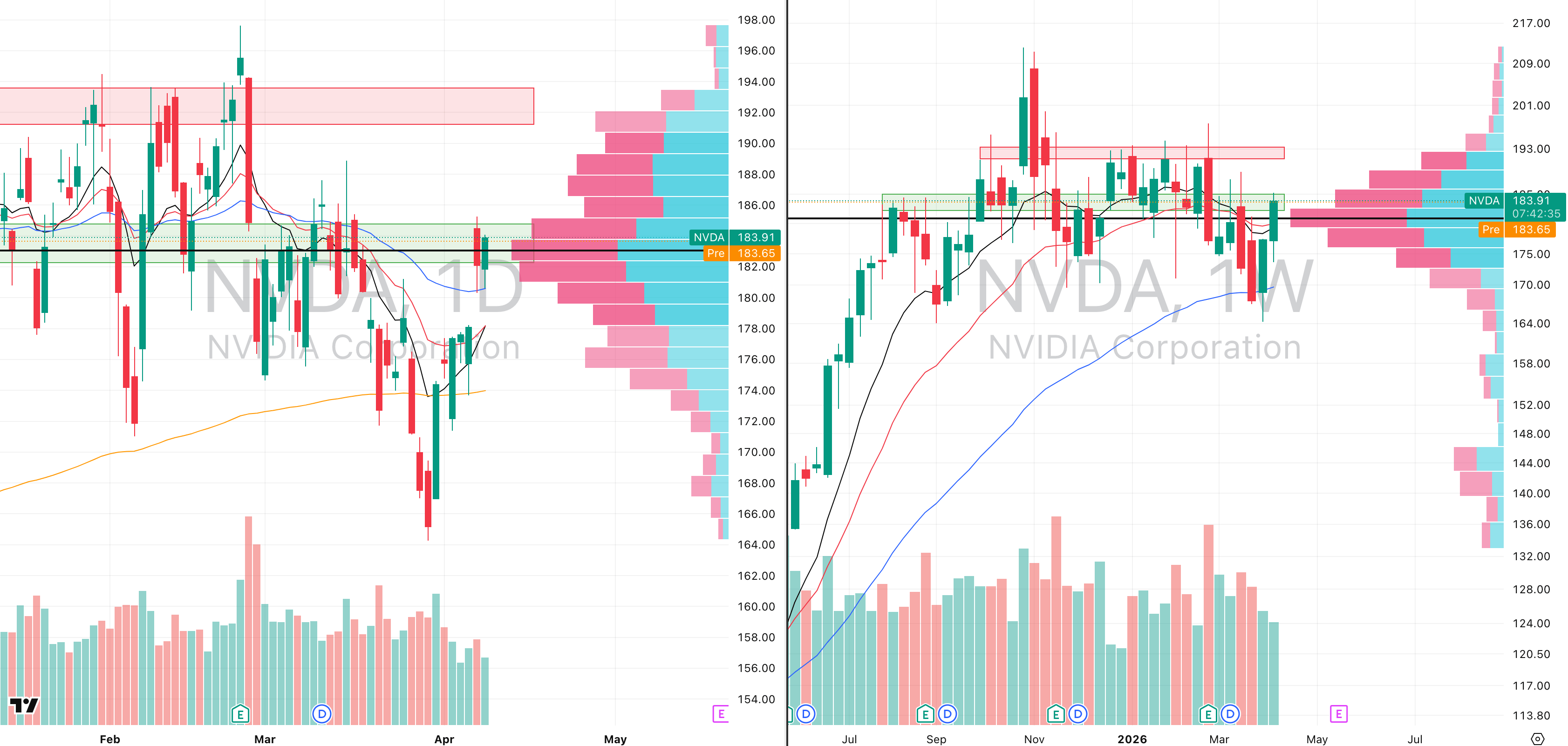 What makes NVDA especially important right now is the visible range volume profile, where there is a clear low-volume pocket between current price near $184 and the next major supply zone around $191.32.