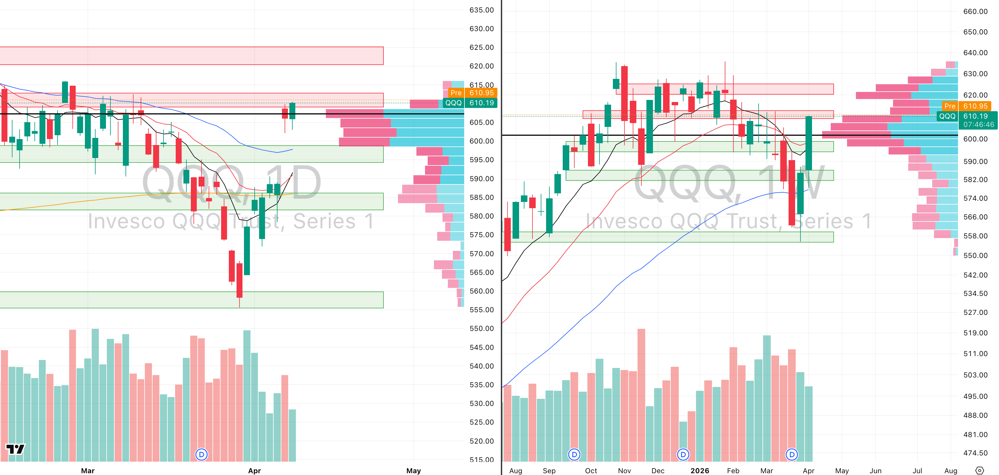 Relative volume remains critical to monitor here because the Nasdaq is now trading directly into a very dense overhead supply zone on the visible range volume profile.