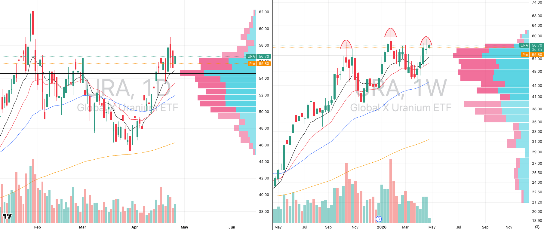 Technically, URA is now forming what increasingly resembles a triple-top structure, and while we do not view that as a major trend failure, it does raise the probability of a pullback toward the 10-week moving average near 53.1, which also aligns closely with the 20-day moving average and point of control. That implies roughly 5% downside, which is entirely normal after the recent move.
