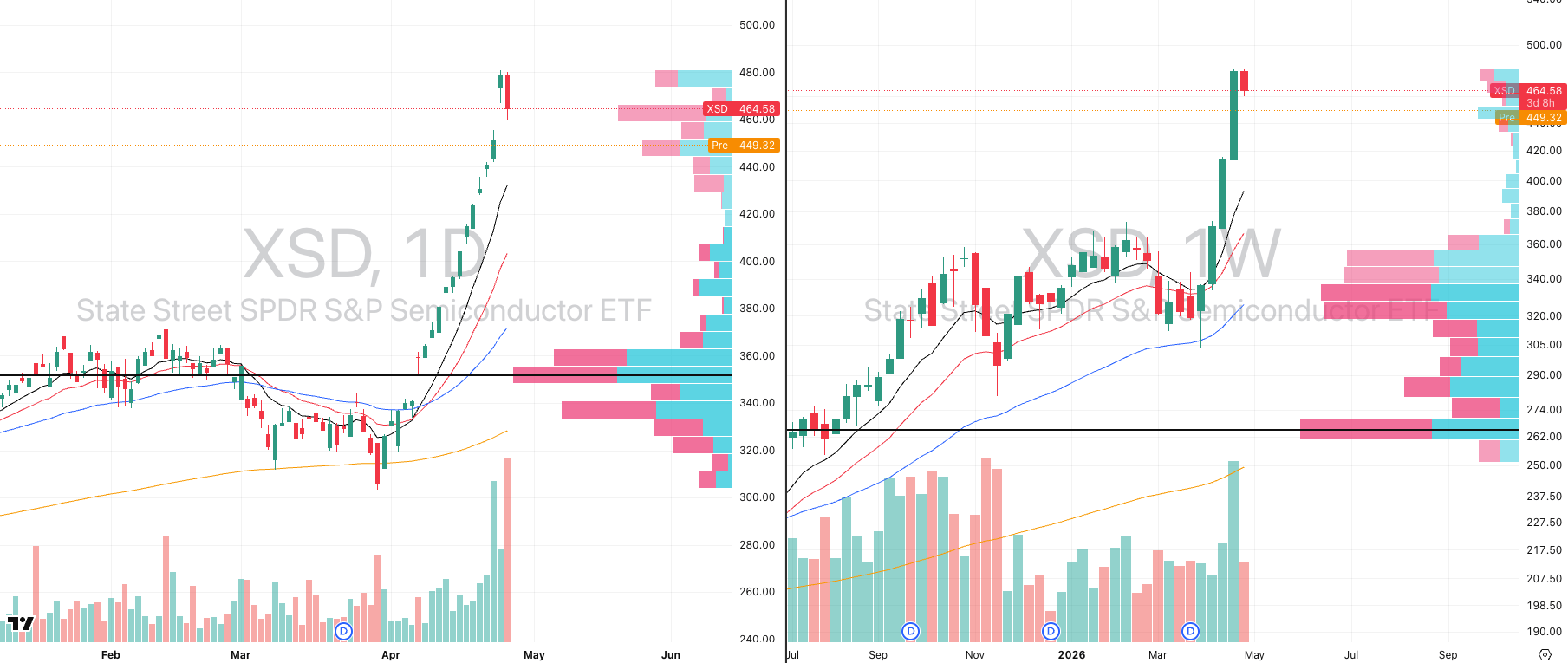 The clearest pressure point sat exactly where we highlighted it yesterday: semiconductors. XSD had pushed into an extreme 13 ATR multiple extension from its 50-day EMA, which placed the group firmly into parabolic territory.